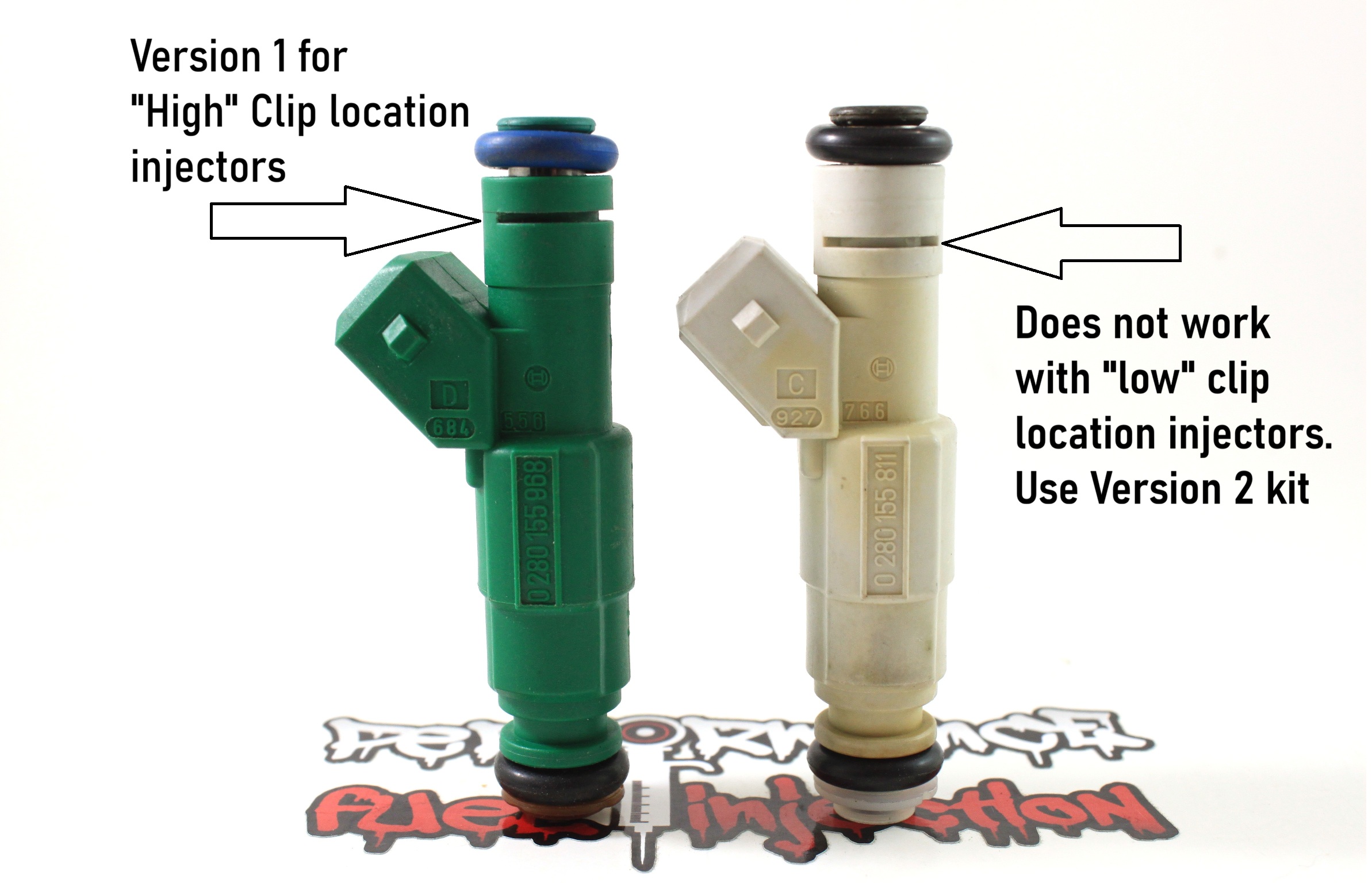 Version 1 PFi billet fuel rail spacer kit for the VW / Audi 1.8T intake manifold when using the longer 60mm “tall” fuel injector with “High” clip provision (see pic). This kit will work with a number of different EV6 based Bosch “60mm” length injectors, including those supplied by PFi, FIC, Deatschwerks and other retailers. We have a Version 2 kit for use with 60mm length injectors with the “low” clip provision. If your injectors have BOTH high and low clip provisions, you must use the High position with these spacers. If you are unsure if this kit will work for you, please feel free to shoot us an email.